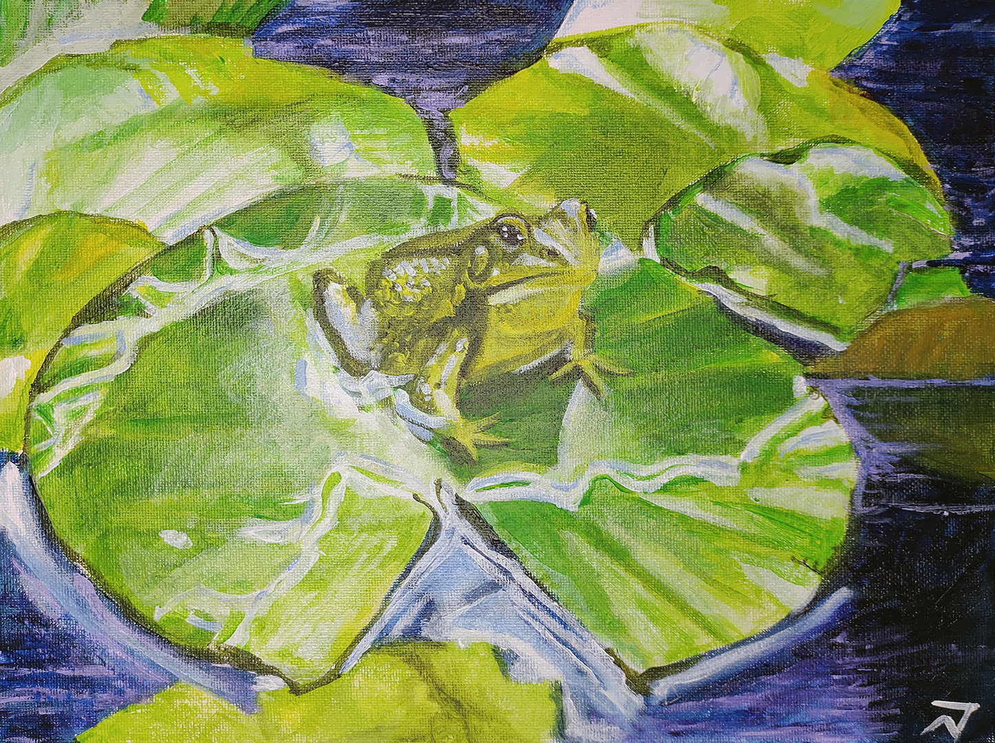 A frog is perched on a vibrant green lily pad surrounded by water, creating a serene natural scene. The lily pads have various shades of green with subtle shading and reflections.