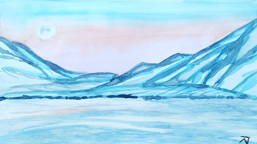 A serene landscape features mountains with snow-capped peaks, under a soft, pastel-colored sky. An indistinct pale moon is visible, casting a gentle glow over the tranquil scene.
