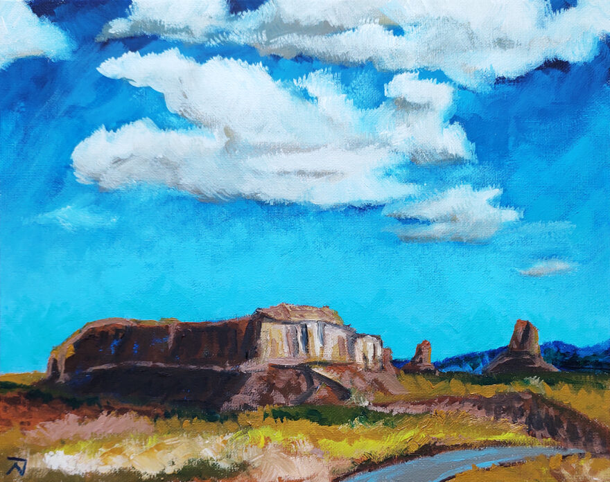 A vibrant landscape showcases an expansive blue sky dotted with fluffy clouds over rocky structures and open plains. The scene captures the rich earthy tones of the terrain, with a hint of distant mountains under a bright sky. Photo modified from pexel
